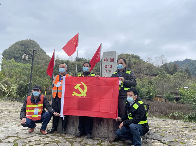 边境守卡人员在界碑前与国旗合影