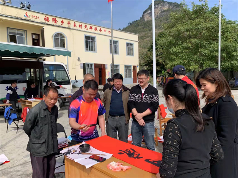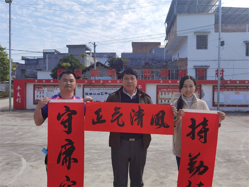 近日,大新县福隆乡纪委携“廉”进村,与大新县图书馆几位擅长书法的文艺志愿者一起,到平良村文化广场,挥毫泼墨写春联,将反腐倡廉的内容写入春联,以春联这种传统年俗为载体,将清廉文化送入家家户户。“这些春联不仅字写得好,内容也有深意,贴在家门上很提气。”平良村党员许英涵高兴地说。